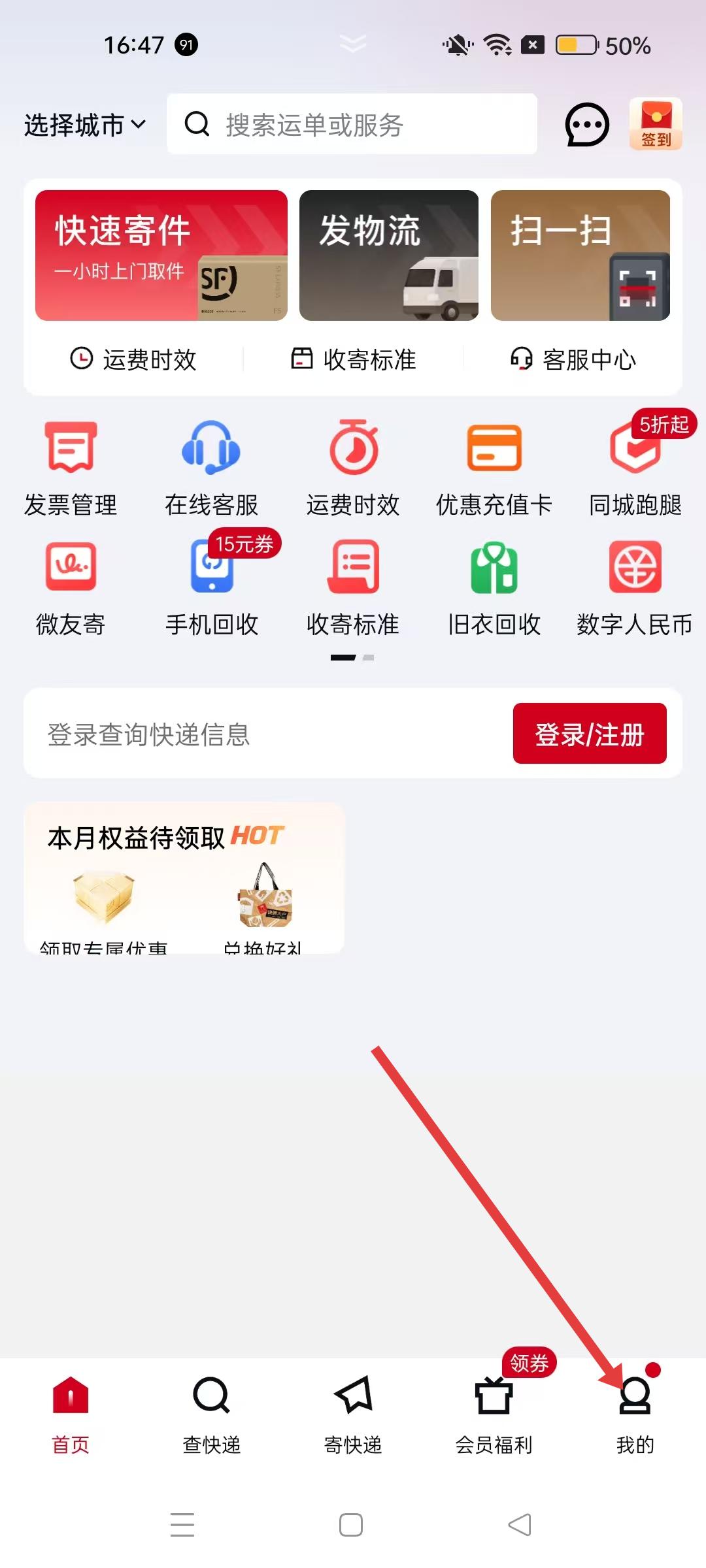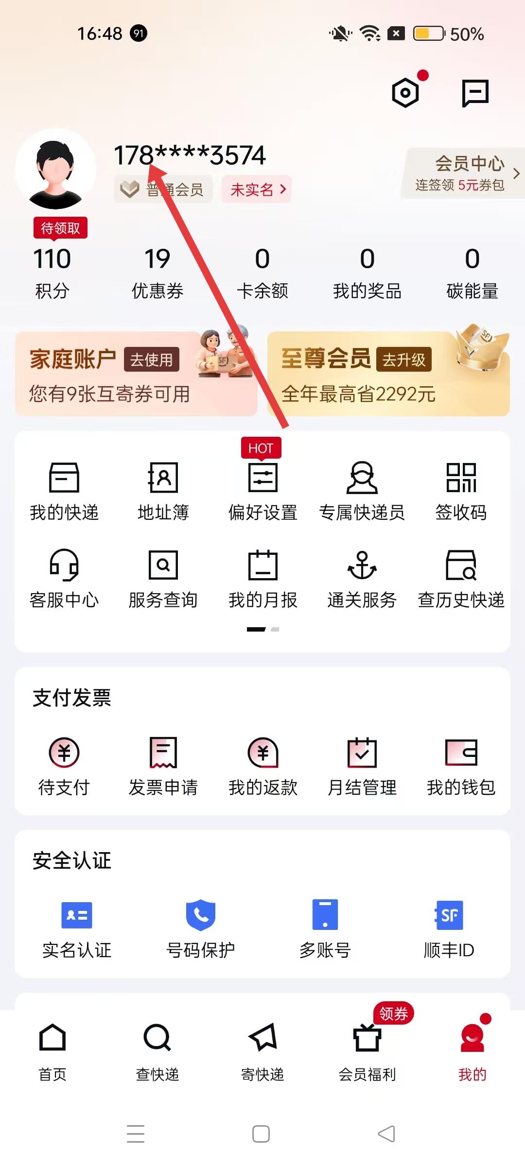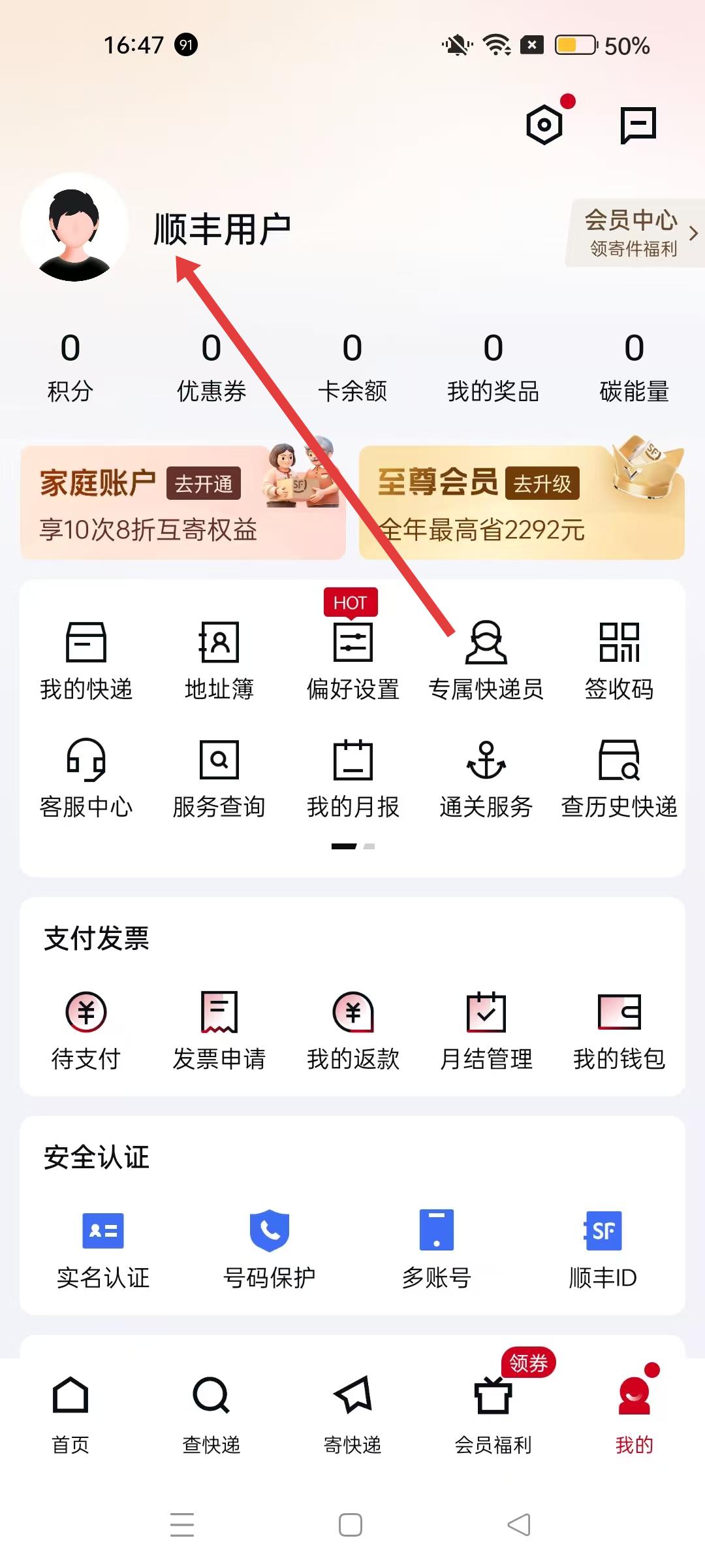 1、順豐APP首頁,點擊右下角我的,進入個人中心界面,可進行賬號相關(guān)操作及功能管理。