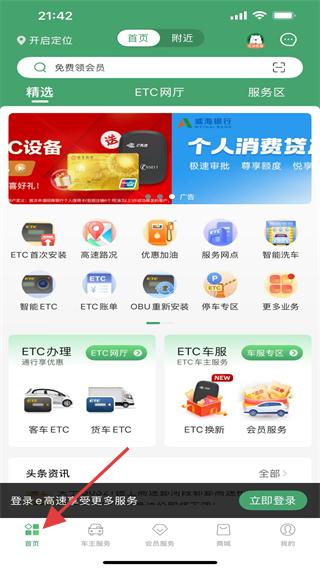 2、首頁有ETC首次安裝、高速路況等功能入口,服務(wù)涵蓋ETC辦理、車服等,還有頭條資訊板塊,可了解高速相關(guān)信息。
