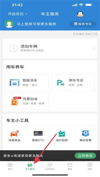 3、車主服務(wù)頁可添加車輛,用車養(yǎng)車服務(wù)有智能洗車、優(yōu)惠加油等,車主小工具含違章高發(fā)、油價趨勢等,功能實用。