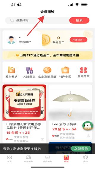 4、會員商城頁,可搜索好物,有愛車養(yǎng)護、大牌美妝等分類,展示電影票兌換券、Lee長柄傘等商品,可金幣加現(xiàn)金兌換。