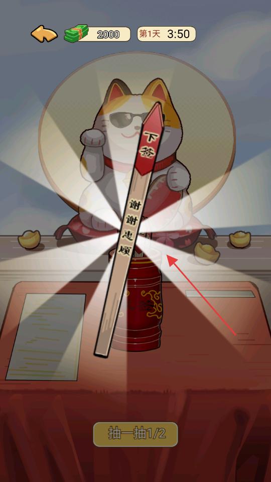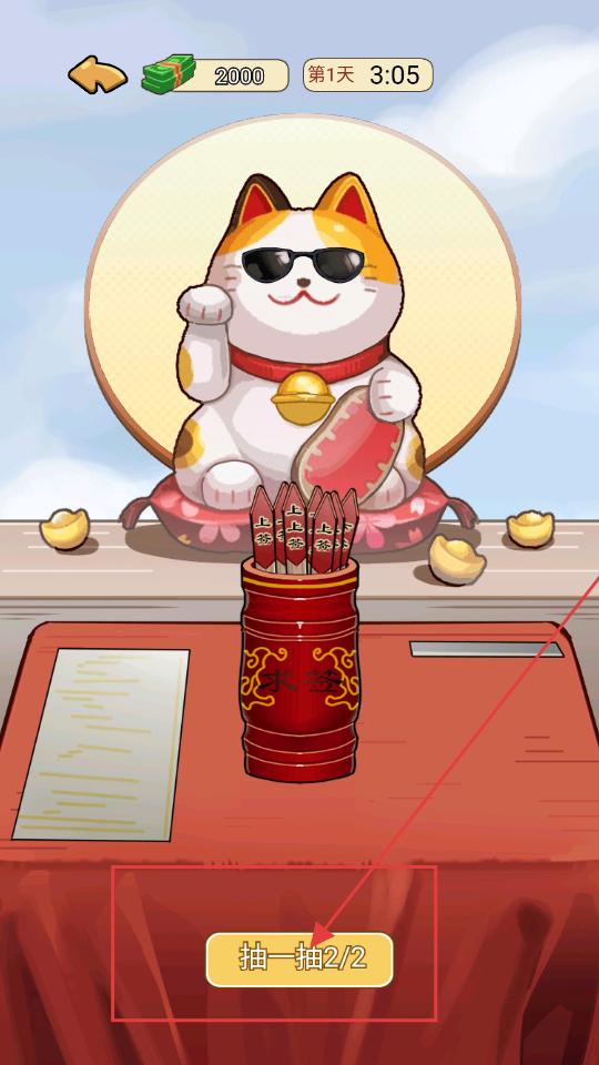 3、進(jìn)入求簽場景后看到招財(cái)貓和簽筒,點(diǎn)擊抽一抽按鈕,進(jìn)行求簽操作,此時(shí)留意簽筒中的簽數(shù)和剩余抽取次數(shù),體驗(yàn)求簽帶來的隨機(jī)結(jié)果。