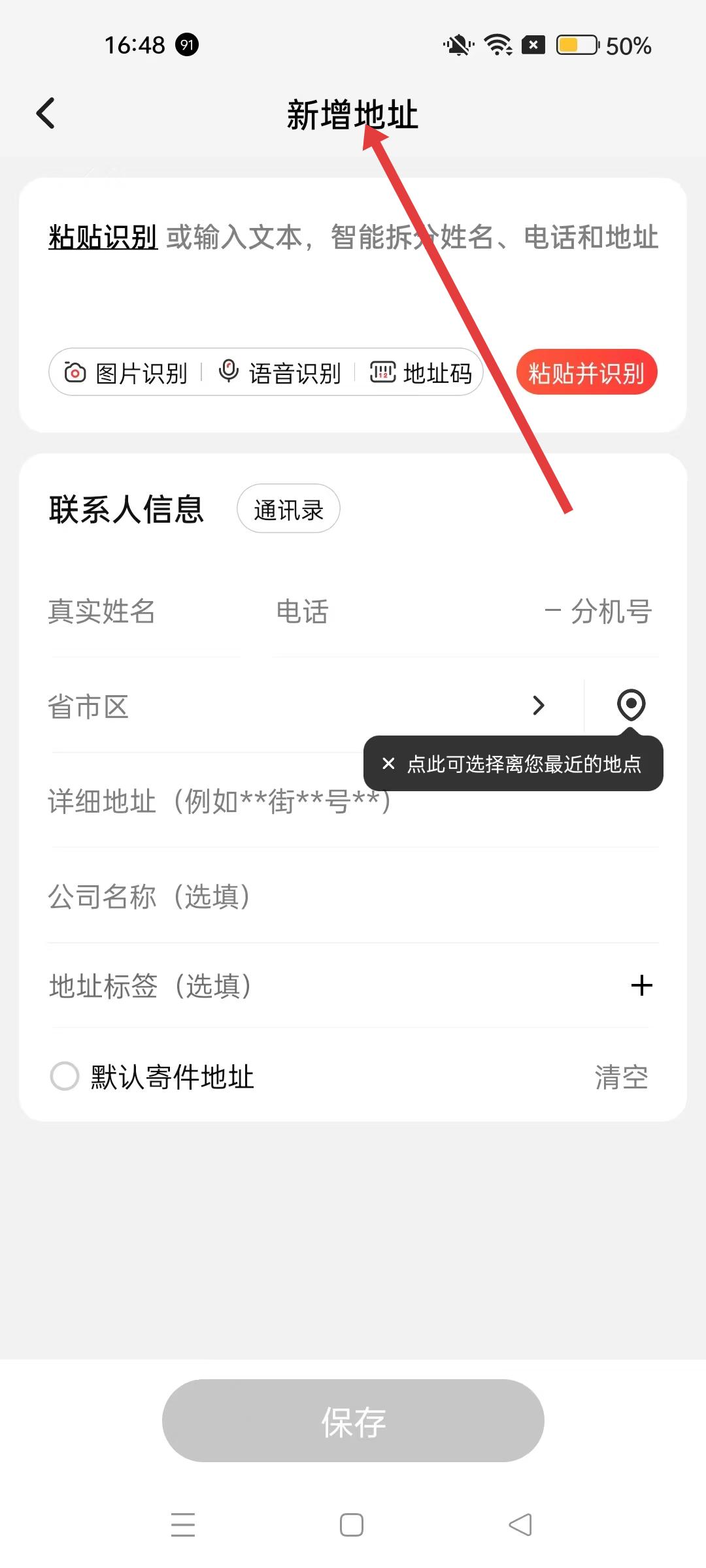 4、新增地址界面,可通過粘貼識(shí)別或手動(dòng)輸入的方式添加聯(lián)系人信息和地址,方便后續(xù)寄件使用。