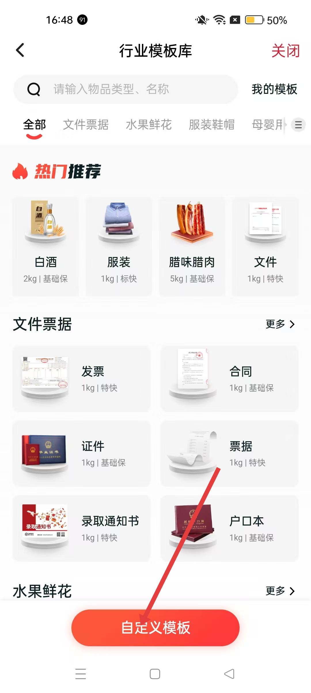 3、行業(yè)模板庫,可選擇熱門推薦或各類分類模板,也可點(diǎn)擊自定義模板,根據(jù)需求創(chuàng)建專屬寄件模板。