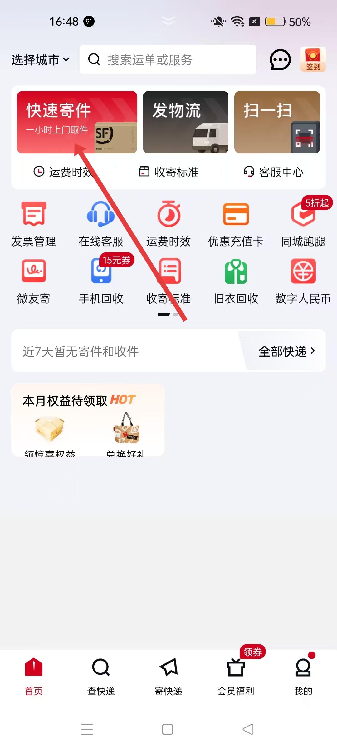 1、順豐APP首頁,點(diǎn)擊快速寄件,進(jìn)入寄件流程,可享受一小時(shí)上門取件服務(wù),便捷寄遞物品。
