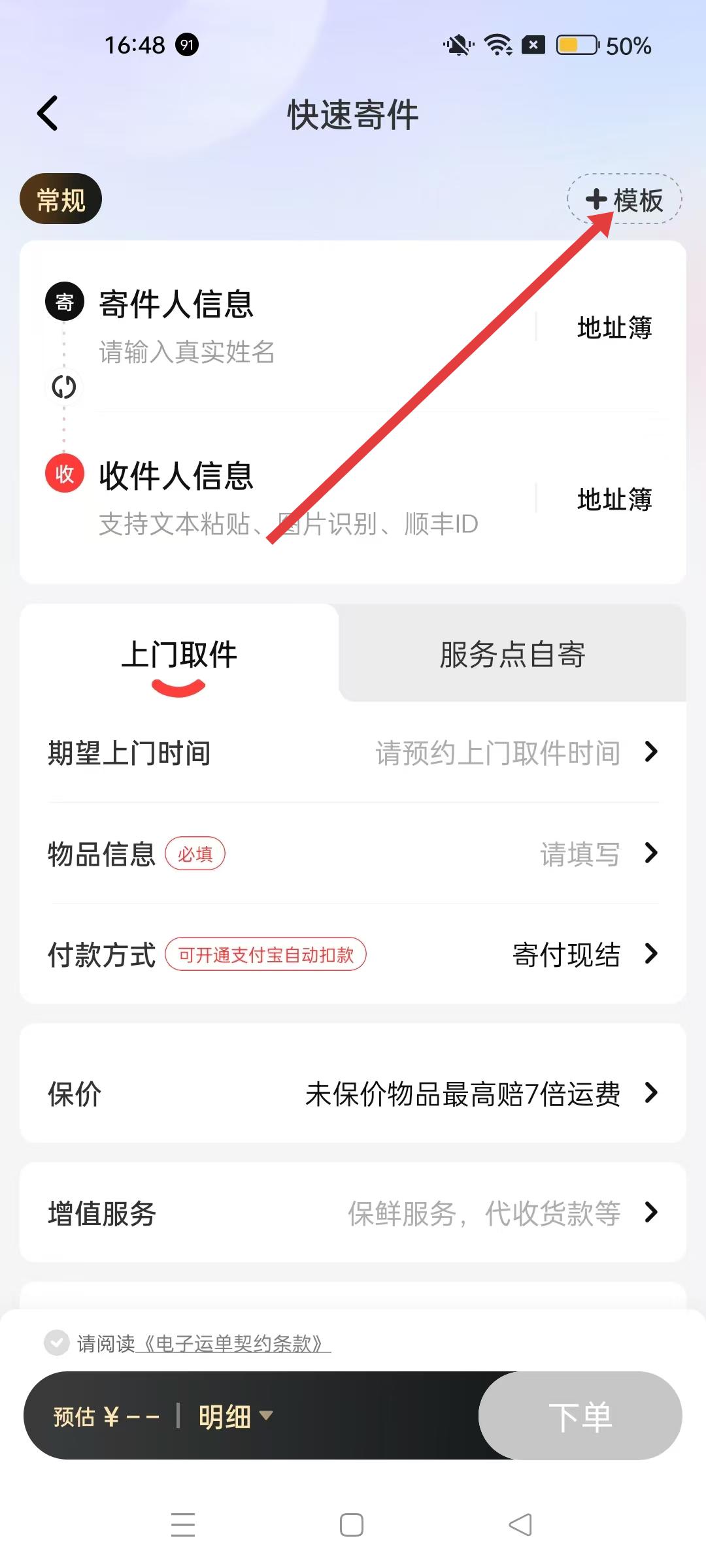 2、快速寄件界面,點(diǎn)擊模板,可進(jìn)入行業(yè)模板庫,選擇合適的寄件模板,簡化寄件信息填寫。