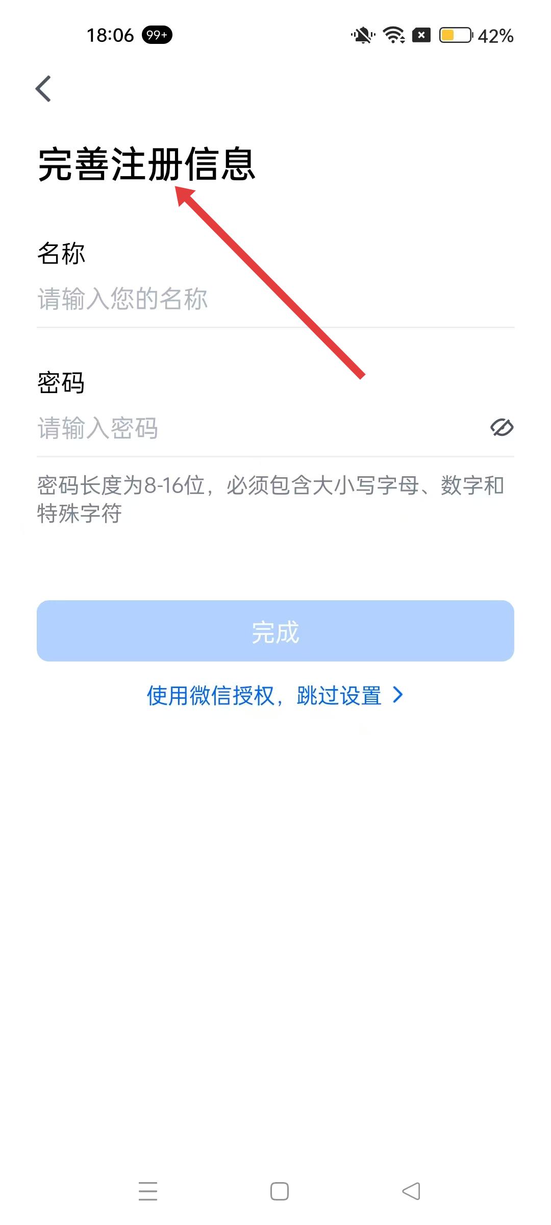 3、新用戶注冊的完善注冊信息界面,輸入名稱和密碼,點擊完成,即可完成賬號注冊。也可選擇使用微信授權,跳過設置步驟。