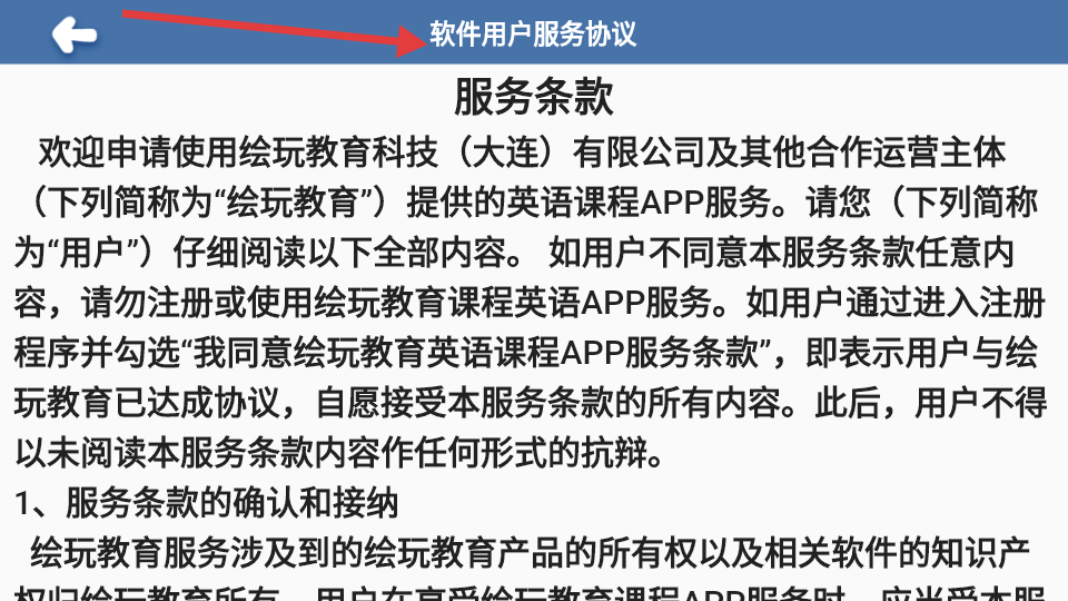 1、這是繪玩教育英語課程APP的軟件用戶服務協(xié)議頁,由繪玩教育提供服務,用戶注冊使用即表示同意相關條款,不得事后抗辯。
