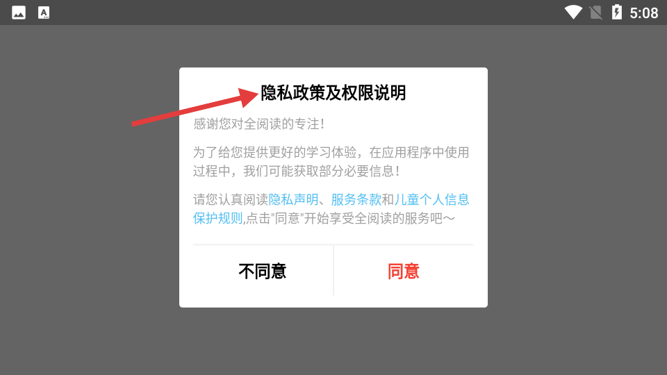 2、展示的是ireadABC隱私政策及權限說明彈窗,為優(yōu)化體驗或獲取信息,邀用戶閱讀規(guī)則點擊同意享受服務。