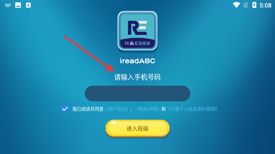 3、ireadABC登錄界面,界面提示輸入手機號碼,下方有已勾選的協(xié)議項,確認后點擊進入班級即可開啟學習之旅。