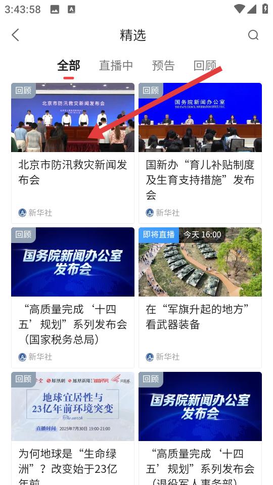 2、精選頻道直播中預(yù)告回顧分類明確,防汛救災(zāi)發(fā)布會(huì)國(guó)新辦政策解讀等內(nèi)容有序陳列,過往報(bào)道與即將開播的訊息同步呈現(xiàn)。