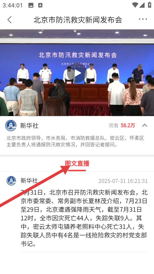 3、點(diǎn)開北京市防汛救災(zāi)新聞發(fā)布會(huì)視頻直播與圖文報(bào)道同步更新,官方通報(bào)災(zāi)情數(shù)據(jù),細(xì)節(jié)與背景深度解析,多形式呈現(xiàn)讓用戶直觀掌握時(shí)事進(jìn)展。