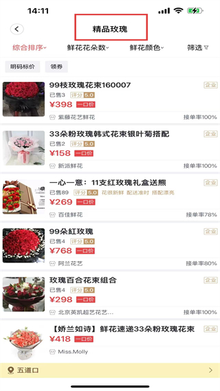 1、精品玫瑰板塊展示99枝玫瑰、33朵粉玫瑰等花束,價格158、768元,商家接單率多100,可明碼標價領(lǐng)券。