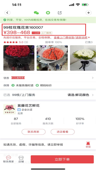 2、某鮮花99枝玫瑰花束商品頁,價398、468元,商家紫藤花藝企業(yè)認證,接單率100,支持未服務(wù)退,可領(lǐng)券下單。