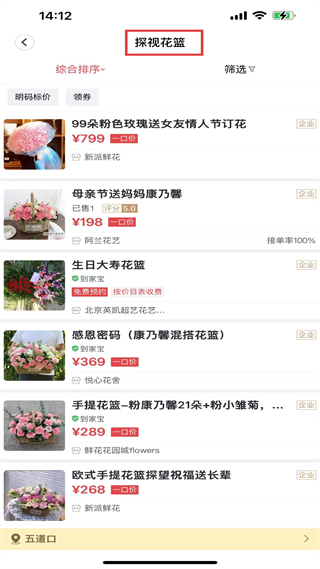 4、探視花籃板塊,展示玫瑰、康乃馨花籃等,價198、799元,商家接單率有100的,可明碼標價領(lǐng)券。