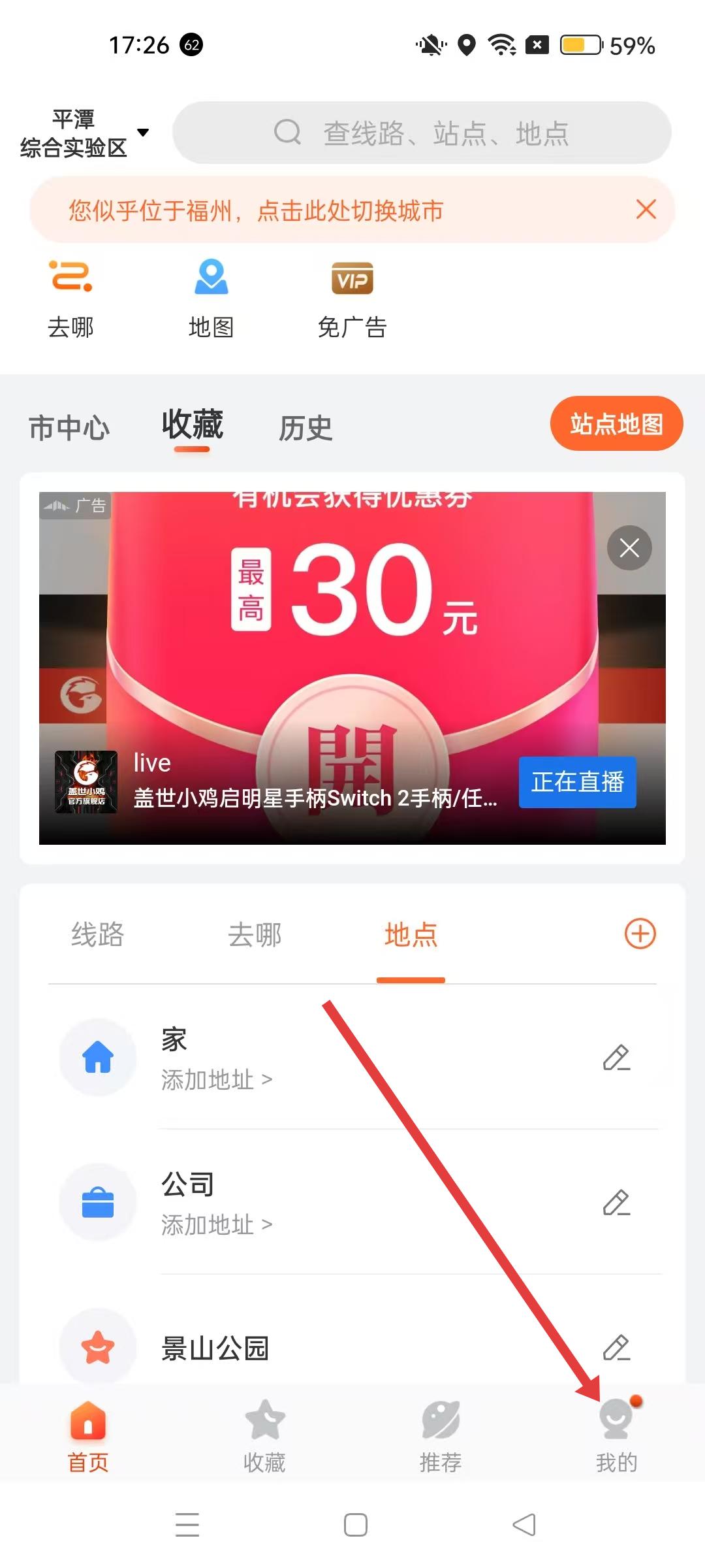 1、進(jìn)入掌上公交首頁,可切換城市為平潭綜合實驗區(qū),點擊底部我的可進(jìn)入個人界面,查看收藏的地點等信息。