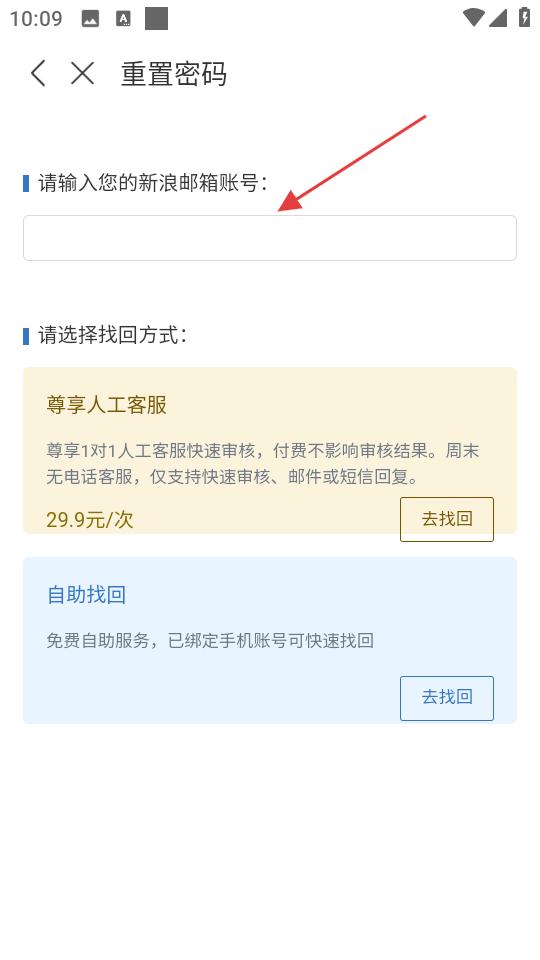 3、重置密碼頁(yè)面,需先輸入新浪郵箱賬號(hào),然后可選擇尊享人工客服或自助找回方式來(lái)重置密碼。