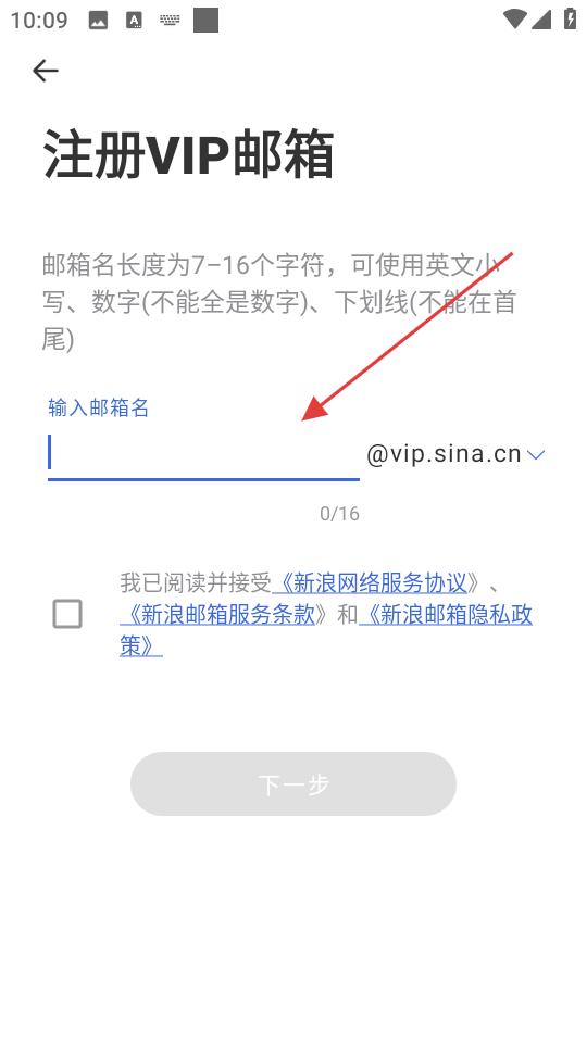 4、注冊(cè)VIP郵箱頁(yè)面,根據(jù)要求輸入郵箱名后勾選接受相關(guān)協(xié)議,即可點(diǎn)擊下一步。