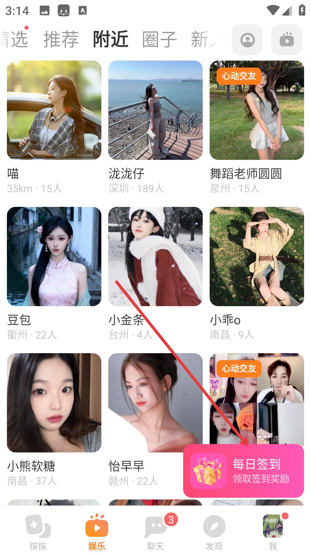 1、打開探探APP,進(jìn)入主界面看到每日簽到按鈕,點(diǎn)擊該按鈕,進(jìn)入每日簽到頁面。
