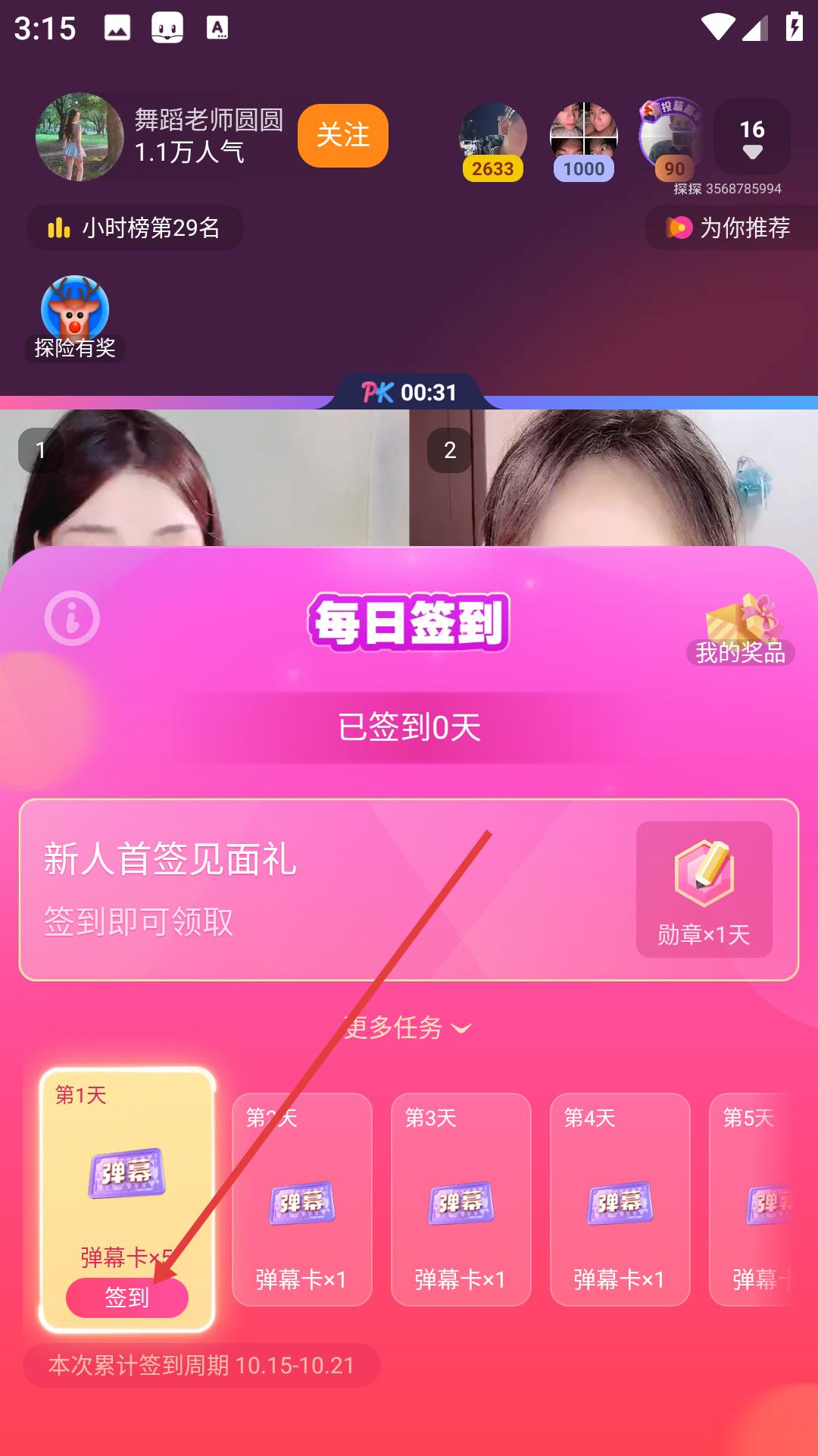 2、在每日簽到頁面,看到第1天等簽到天數(shù)選項(xiàng),點(diǎn)擊第1天對(duì)應(yīng)的簽到按鈕,完成當(dāng)天簽到。