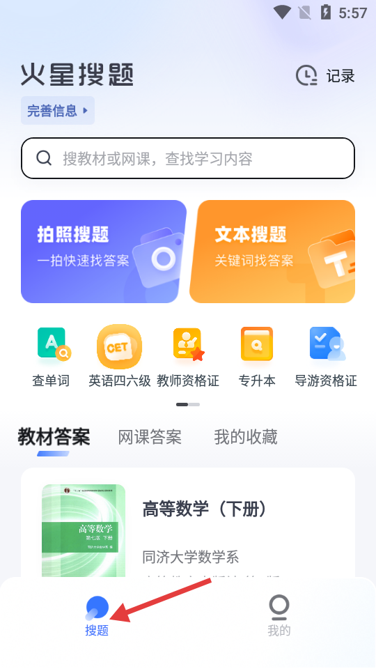 2、應(yīng)用搜題面功能豐富,可拍照或文本搜題,設(shè)有查單詞等入口,還展示教材答案像高等數(shù)學(xué)下冊(cè)等資源。