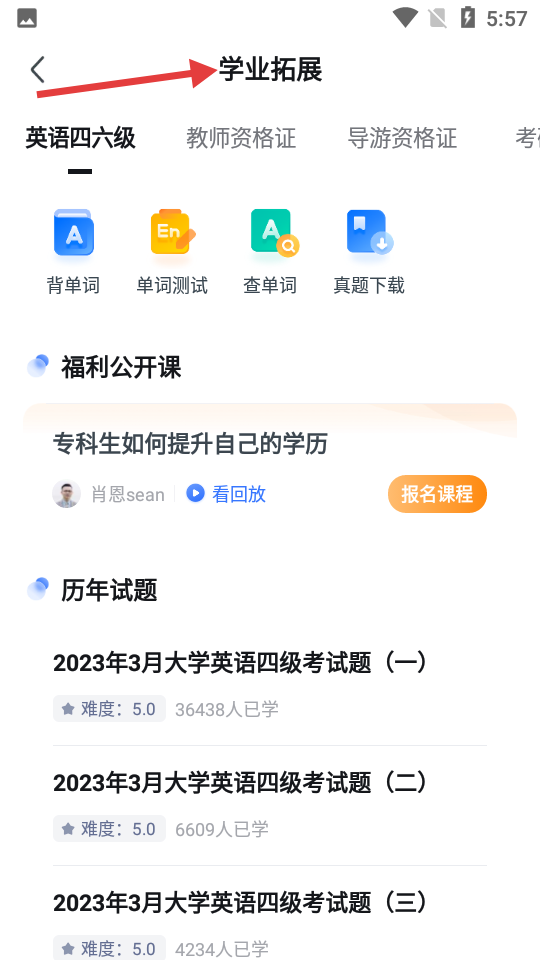 3、學(xué)業(yè)拓展頁(yè)面聚焦英語(yǔ)四六級(jí)等考證,提供背單詞、真題下載等功能,并有福利公開(kāi)課及歷年試題可查看。