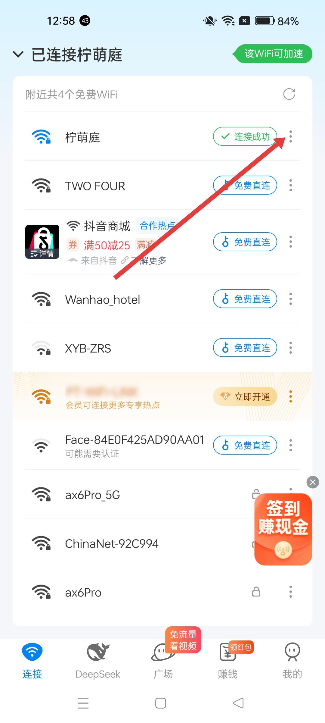 1、已連接WiFi的界面,點(diǎn)擊目標(biāo)WiFi右側(cè)的更多選項(xiàng)按鈕,展開WiFi相關(guān)操作菜單。