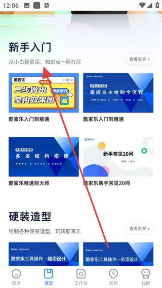 1、進(jìn)入課堂頁(yè)面,可查看新手入門板塊的課程,如酷家樂(lè)入門到精通的室內(nèi)效果圖制作課程,點(diǎn)擊查看更多,深入學(xué)習(xí)設(shè)計(jì)知識(shí)。