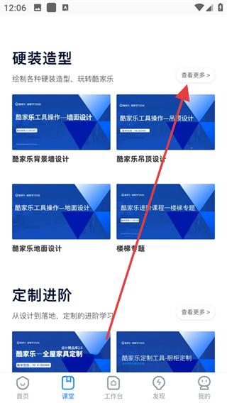 2、在課堂頁(yè)面還可查看硬裝造型板塊的課程,如墻面設(shè)計(jì)、吊頂設(shè)計(jì)等,點(diǎn)擊查看更多,學(xué)習(xí)各種硬裝造型的繪制方法。