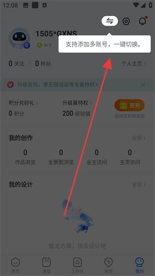 3、進(jìn)入我的頁(yè)面可添加多個(gè)賬號(hào),一鍵切換,方便管理多個(gè)設(shè)計(jì)賬號(hào),同時(shí)可查看我的創(chuàng)作和我的設(shè)計(jì)情況,了解設(shè)計(jì)成果。