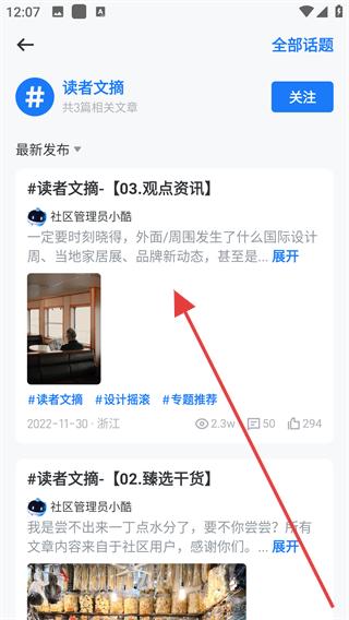 4、進(jìn)入發(fā)現(xiàn)板塊可瀏覽讀者文摘等話題的最新發(fā)布內(nèi)容,如設(shè)計(jì)資訊、干貨文章等,點(diǎn)擊展開(kāi)查看詳細(xì)內(nèi)容,參與社區(qū)互動(dòng),獲取設(shè)計(jì)靈感。