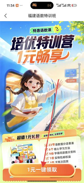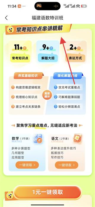3、在福建語數(shù)特訓班課程詳情頁面,點擊1元一鍵領取按鈕,參與該課程的領取活動。