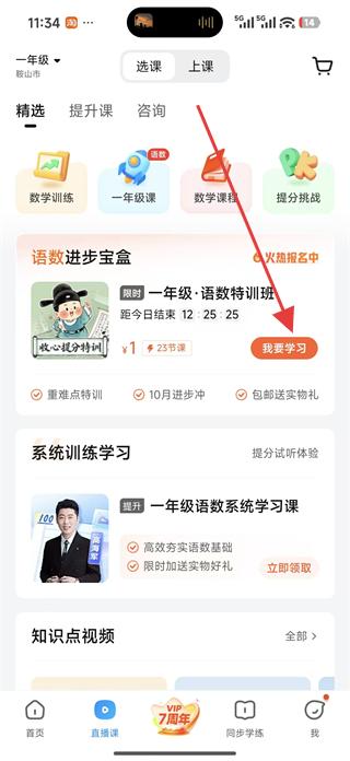 2、在專題課界面找到語數(shù)進步寶盒板塊下的一年級語數(shù)特訓班,點擊我要學習按鈕,進入該課程的詳情頁面。