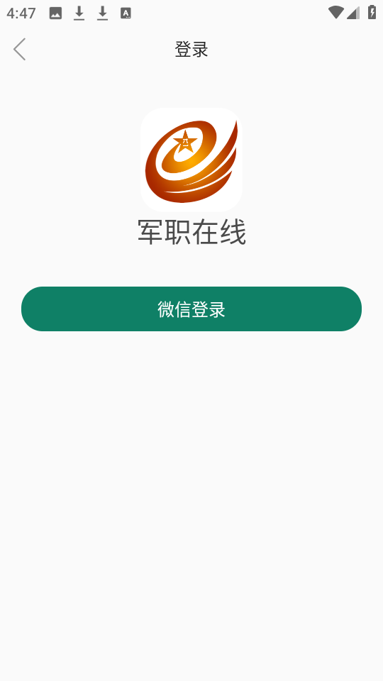 2、點(diǎn)擊登錄界面以白色為底,軍職在線標(biāo)志顯眼,僅設(shè)微信登錄鍵,簡潔直觀助用戶快速登錄,開啟軍事職業(yè)教育學(xué)習(xí)。