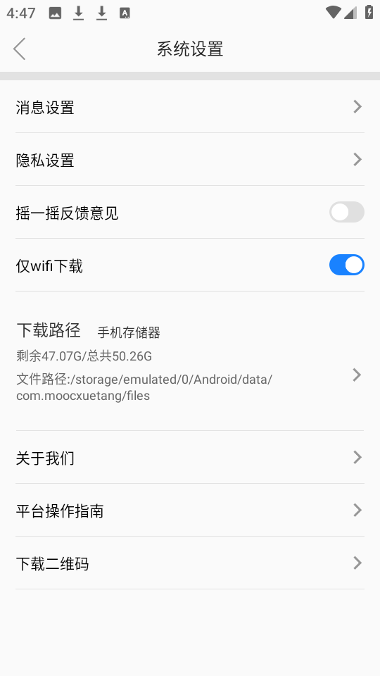 3、點(diǎn)擊系統(tǒng)設(shè)置頁布局清晰,含消息、隱私設(shè)置等,僅wifi下載等開關(guān)實(shí)用,還顯示存儲(chǔ)路徑,便于管理下載與保護(hù)隱私。