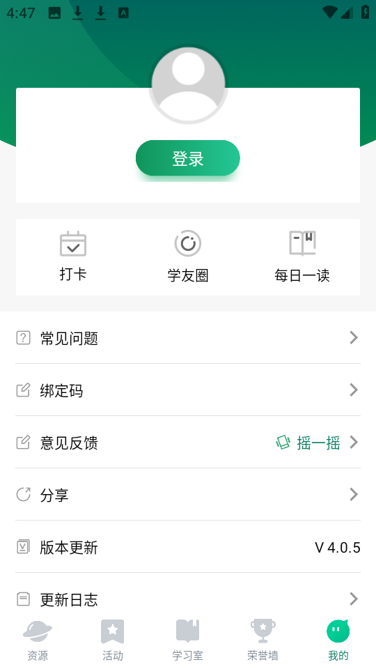 4、我的頁面上部是登錄區(qū)下方有打卡等功能區(qū),以及常見問題等選項(xiàng),版本信息明確為用戶提供便捷個(gè)人管理。