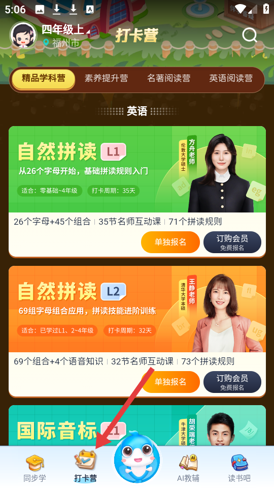 1、打卡營精品學(xué)科營中,英語自然拼讀課程亮眼L1啟蒙、L2進(jìn)階,分別適配不同基礎(chǔ)學(xué)生提供多元報(bào)名選擇。