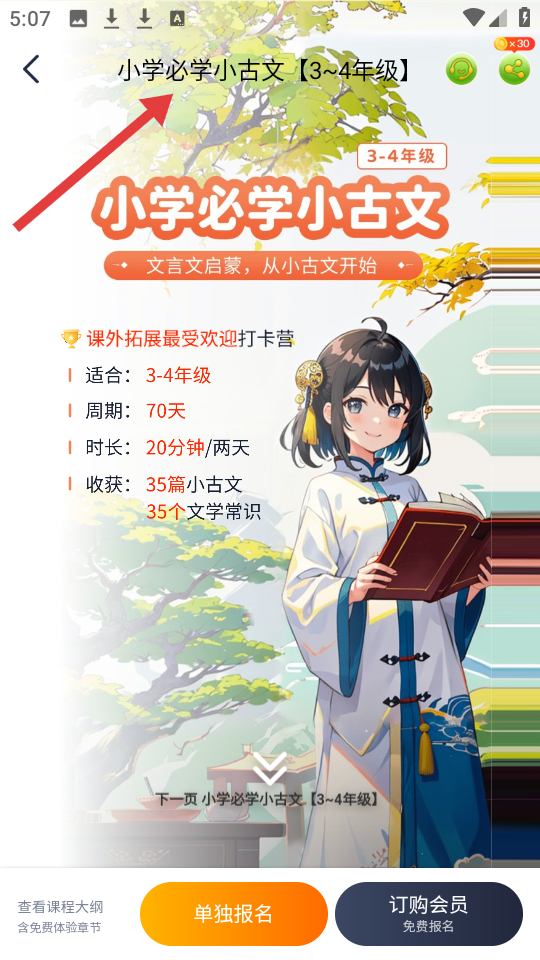 2、小學(xué)必學(xué)小古文打卡營專為3、4年級設(shè),70天學(xué)習(xí)周期,每天20分鐘,助學(xué)生積累小古文與文學(xué)常識可覽大綱。