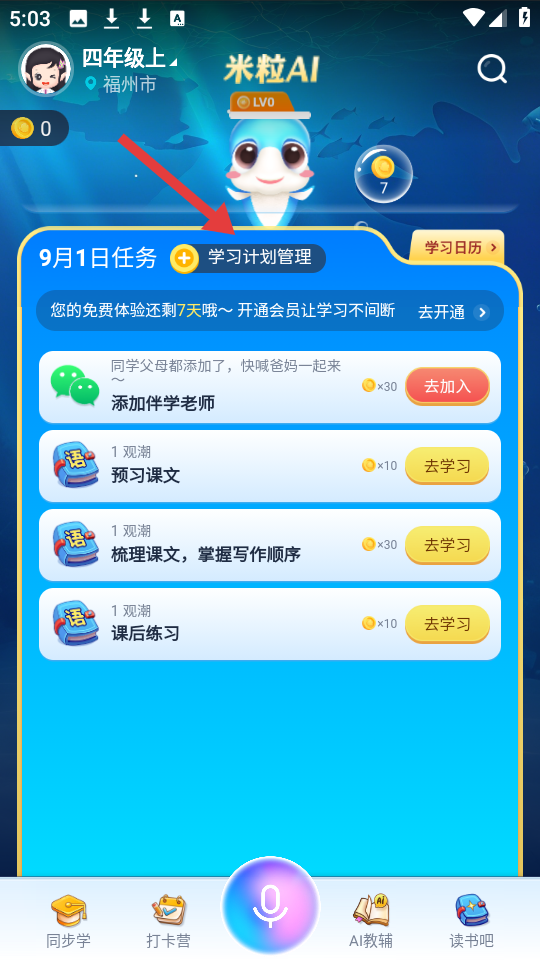 3、米粒AI頁面展示學(xué)習(xí)任務(wù)與計(jì)劃管理,含四年級語文預(yù)習(xí)等任務(wù),提示免費(fèi)體驗(yàn)期,支持添加伴學(xué)老師助力高效學(xué)習(xí)。