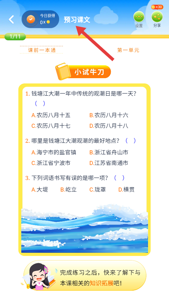 4、預(yù)習(xí)課文頁面以錢塘江大潮為例設(shè)題,考查預(yù)習(xí)效果,完成后有知識拓展環(huán)節(jié)幫助學(xué)生加深對課文的理解與認(rèn)知。