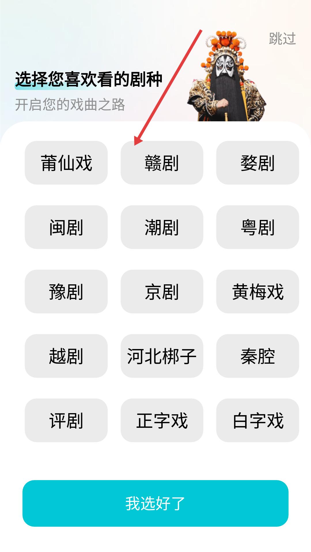 1、在戲曲APP初始頁面可選擇莆仙戲、贛劇等喜愛的劇種,選好后點(diǎn)擊我選好了,開啟戲曲欣賞之旅。