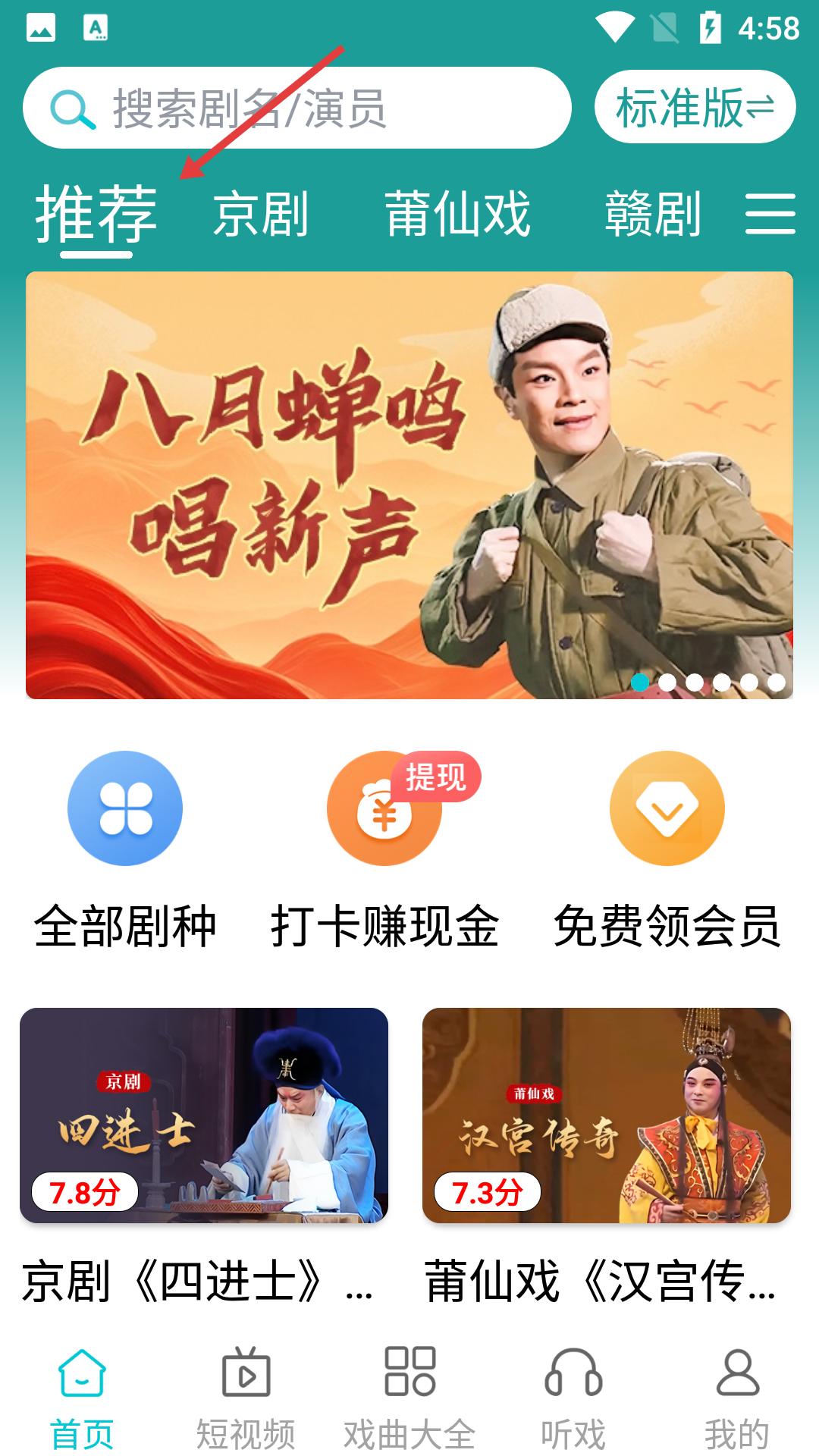 2、APP首頁有搜索框,可搜劇名或演員,還有推薦、京劇等分類標(biāo)簽,以及打卡賺錢、免費(fèi)領(lǐng)會員等功能入口。