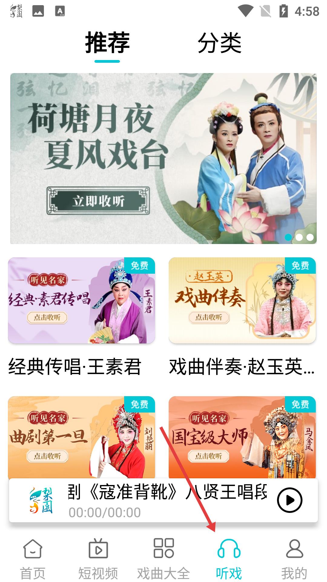 3、點(diǎn)擊底部聽?wèi)?,進(jìn)入聽?wèi)蝽撁妫型扑]和分類板塊,能收聽經(jīng)典傳唱、戲曲伴奏等內(nèi)容,享受戲曲音頻盛宴。