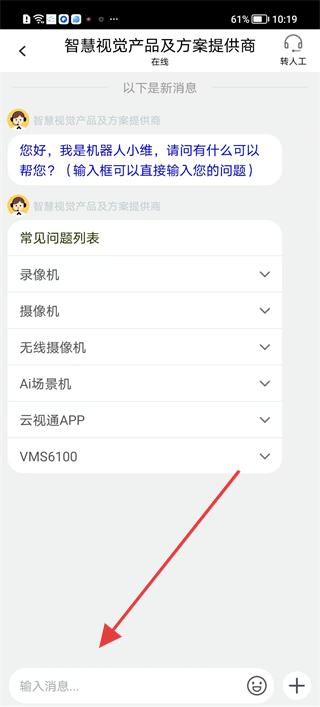 2、進(jìn)入智能客服頁面在輸入框中輸入問題,可咨詢錄像機、攝像機等常見問題,獲取相關(guān)解答。