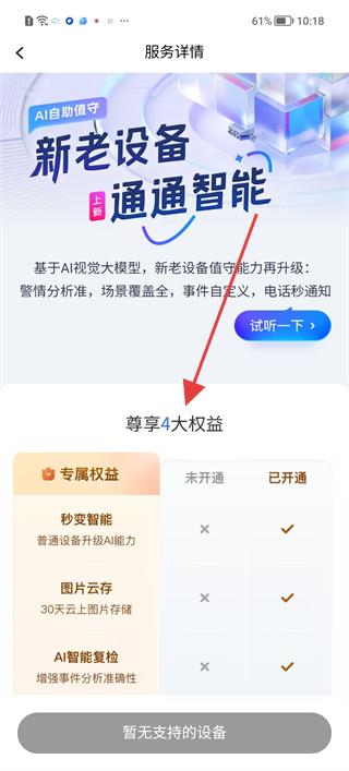 4、在服務(wù)詳情頁面繼續(xù)查看尊享4大權(quán)益,如秒變智能、圖片云存等,了解開通服務(wù)后可享受的權(quán)益。