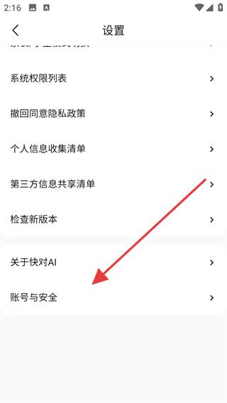 1、打開快對作業(yè)APP,進入設(shè)置頁面在設(shè)置選項中找到賬號與安全,點擊進入相關(guān)設(shè)置頁面。