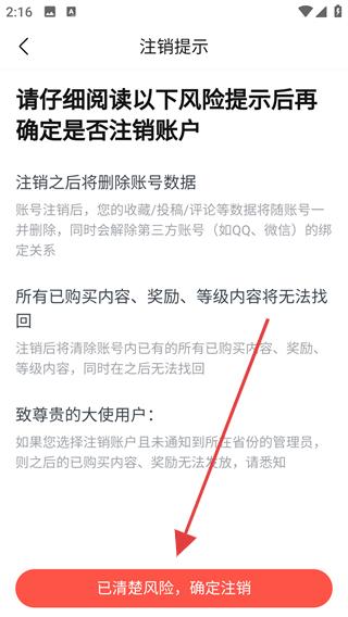 3、仔細閱讀風(fēng)險提示后,若確定要注銷,點擊已清楚風(fēng)險,確定注銷,進入注銷確認頁面。