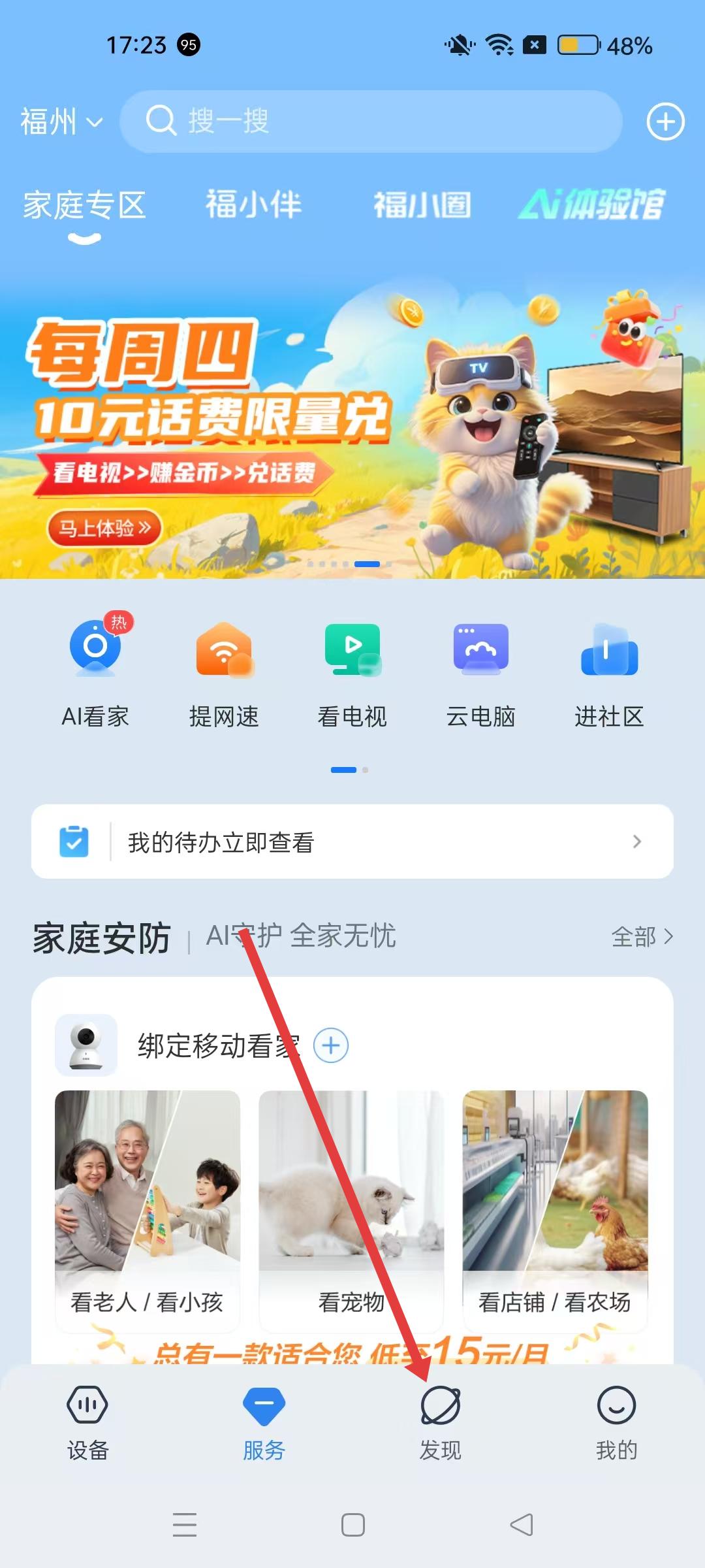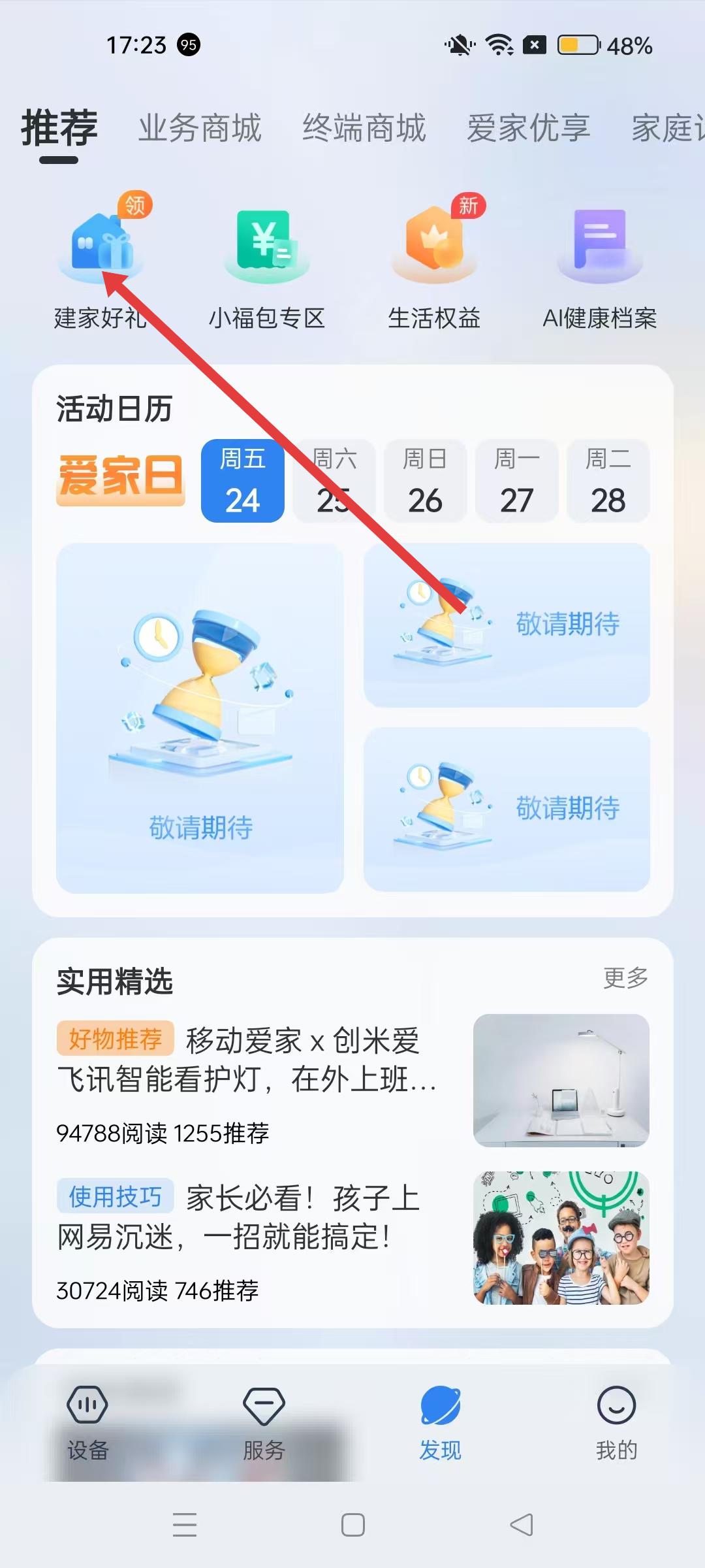 1、移動(dòng)愛家APP首頁,點(diǎn)擊發(fā)現(xiàn),進(jìn)入發(fā)現(xiàn)界面,可查看各類推薦服務(wù)和活動(dòng)。