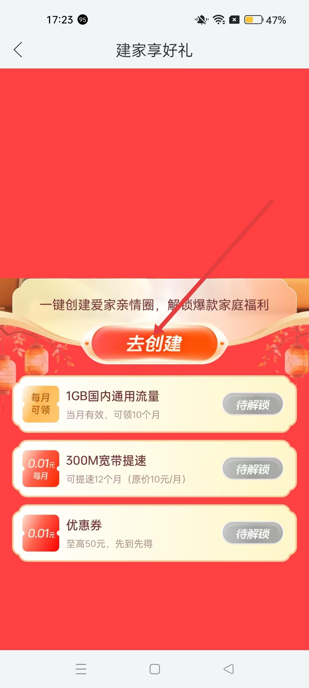 3、建家享好禮頁面,點(diǎn)擊去創(chuàng)建,可創(chuàng)建愛家親情圈,解鎖流量、寬帶提速、優(yōu)惠券等福利。