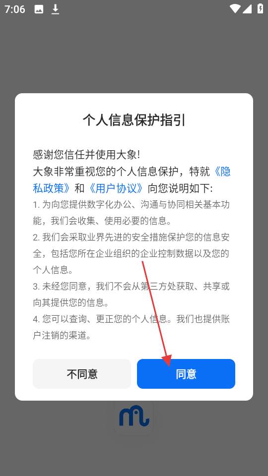 1、首次打開APP會彈出用戶協(xié)議及隱私政策界面,需仔細(xì)閱讀后點擊同意才能繼續(xù)使用APP,這一步是為了確保用戶了解并同意平臺使用個人信息的規(guī)則。