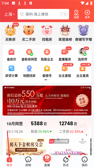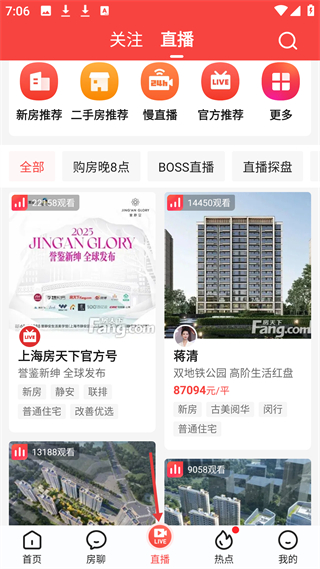 3、直播頁有新房推薦、慢直播等分類,展示上海房天下等直播內容,可看樓盤發(fā)布、探盤直播,了解房產項目詳情。